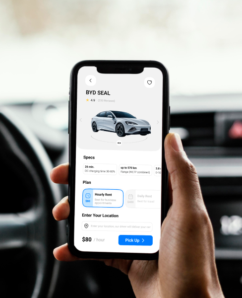 We developed an intuitive interface with easy navigation, which simplifies users’ interaction with the application and makes the rental process as convenient and simple as possible. Users can easily create an account and log in to the app using their data or the voice recognition function. Available cars are displayed on the map and can be filtered by various criteria. In addition, the application provides detailed information about a car, including photos, technical specifications, and a description, so that users can familiarize themselves with a car in more detail before renting it. After completing a trip, you can evaluate the transport and the quality of services, leave your comments, and share this information on social networks. The built-in notification system informs about the rental status, the nearest charging stations and their availability, charge consumption, the time of return, etc. The app also shows information about the amount of carbon dioxide emissions equivalent to the use of electric vehicles. This helps users see what contribution they are making to reducing emissions by choosing a more environmentally friendly car.