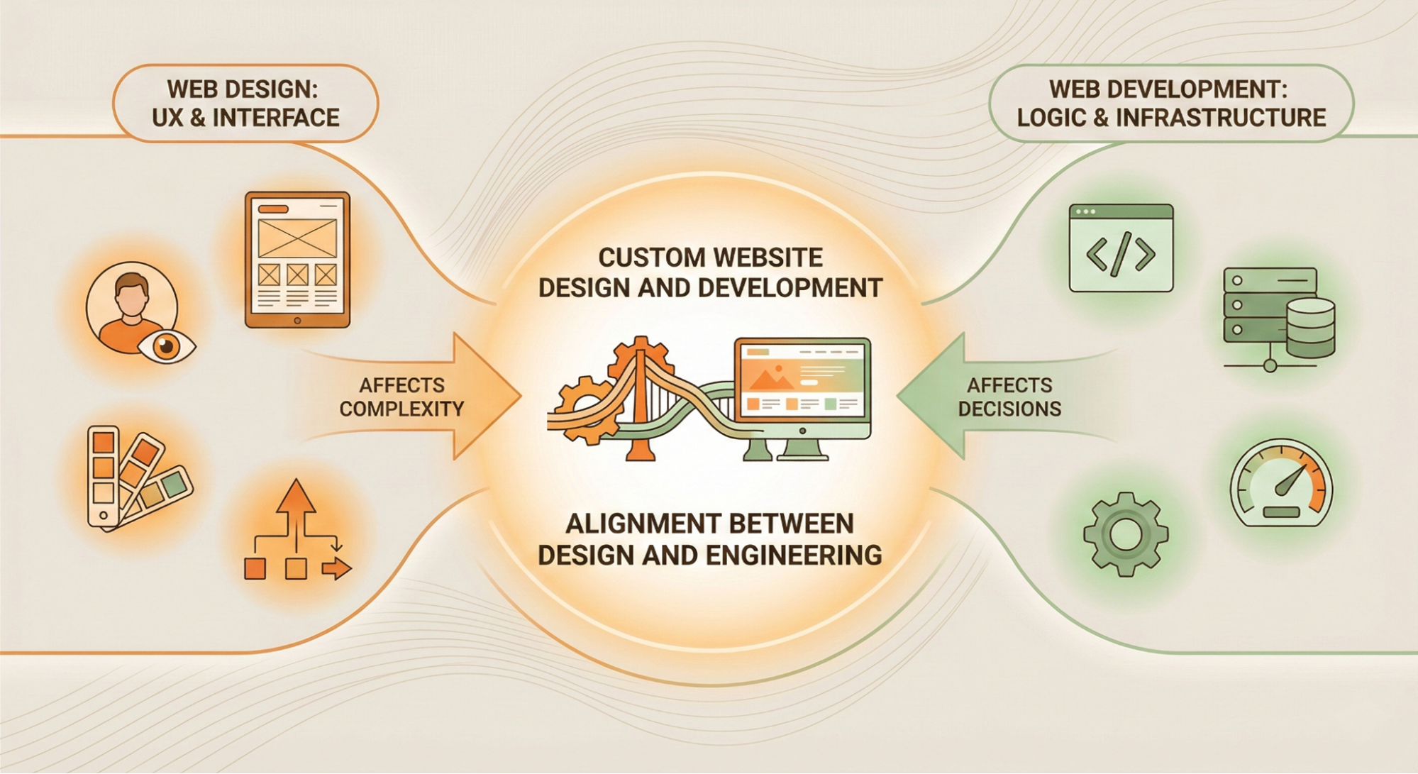 Web design focuses on user experience, interface layout, accessibility, and visual hierarchy. Web development focuses on how the system works. Front-end logic. Back-end services. APIs. Databases. Performance.