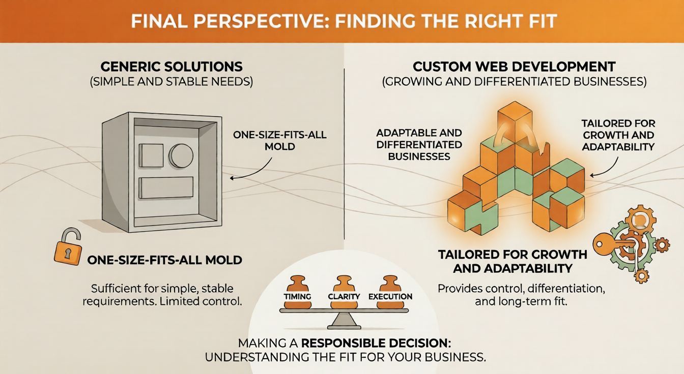 For simple, stable needs, generic solutions may be sufficient. For growing, changing, or differentiated businesses, custom web development services provide control that templates cannot.
