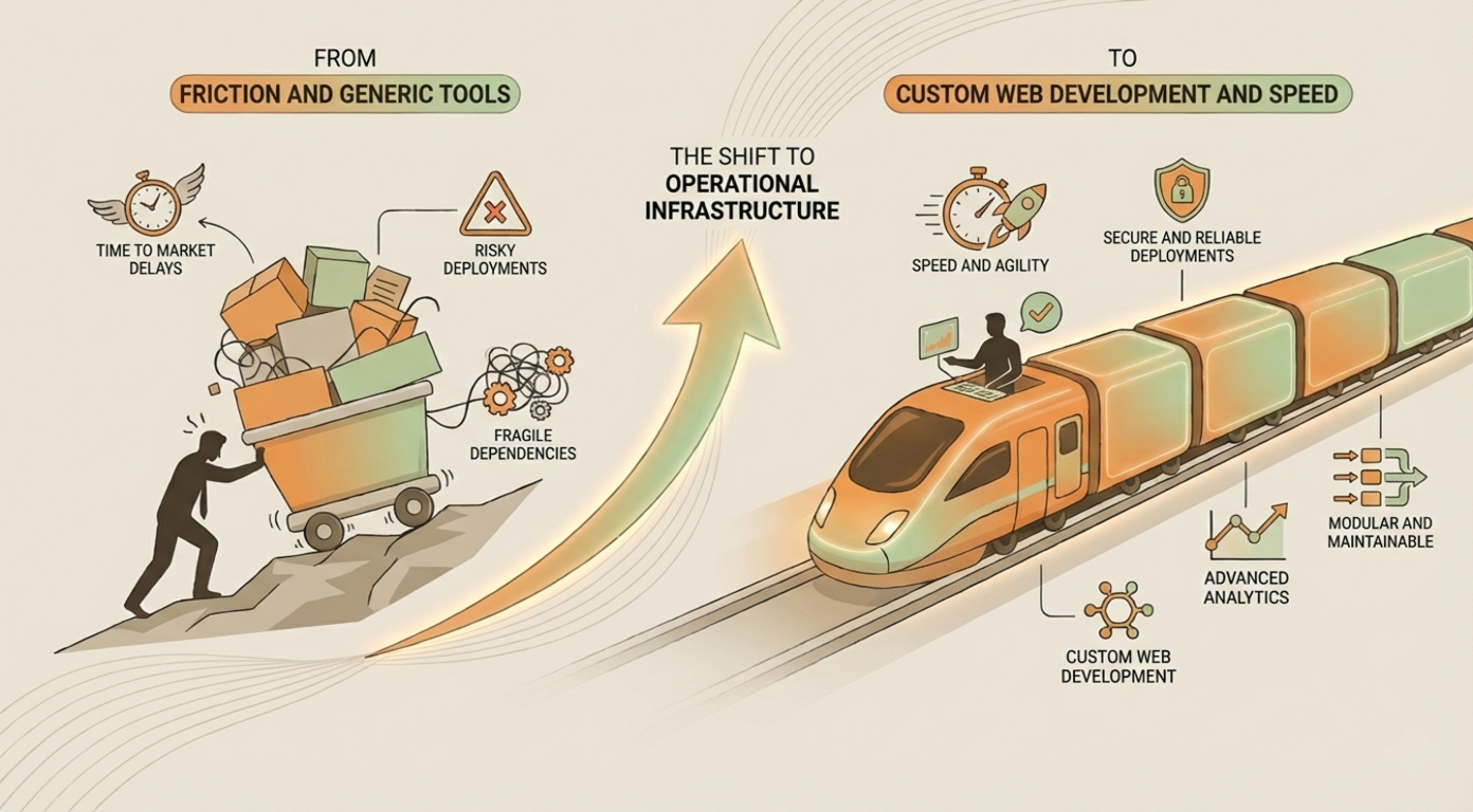 Most companies do not start with custom web development. They arrive there after friction builds.